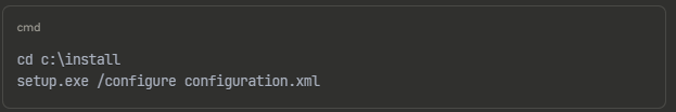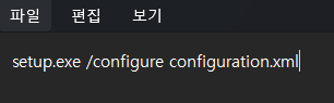• 설명: 이 명령어는 폴더에 있는 setup.exe 파일을 실행하고, 같은 폴더에 있는 configuration.xml 설정 파일을 참조하여 설치를 진행하라는 의미입니다.