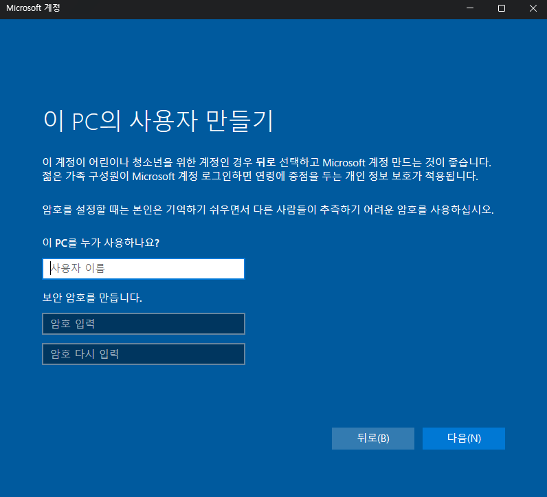 입력 후 엔터를 누르면 바로 로컬 계정 생성 화면으로 넘어갑니다.